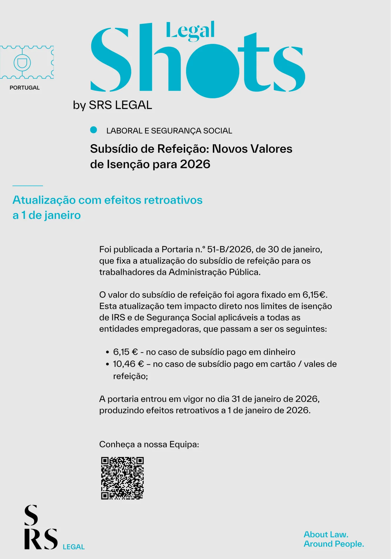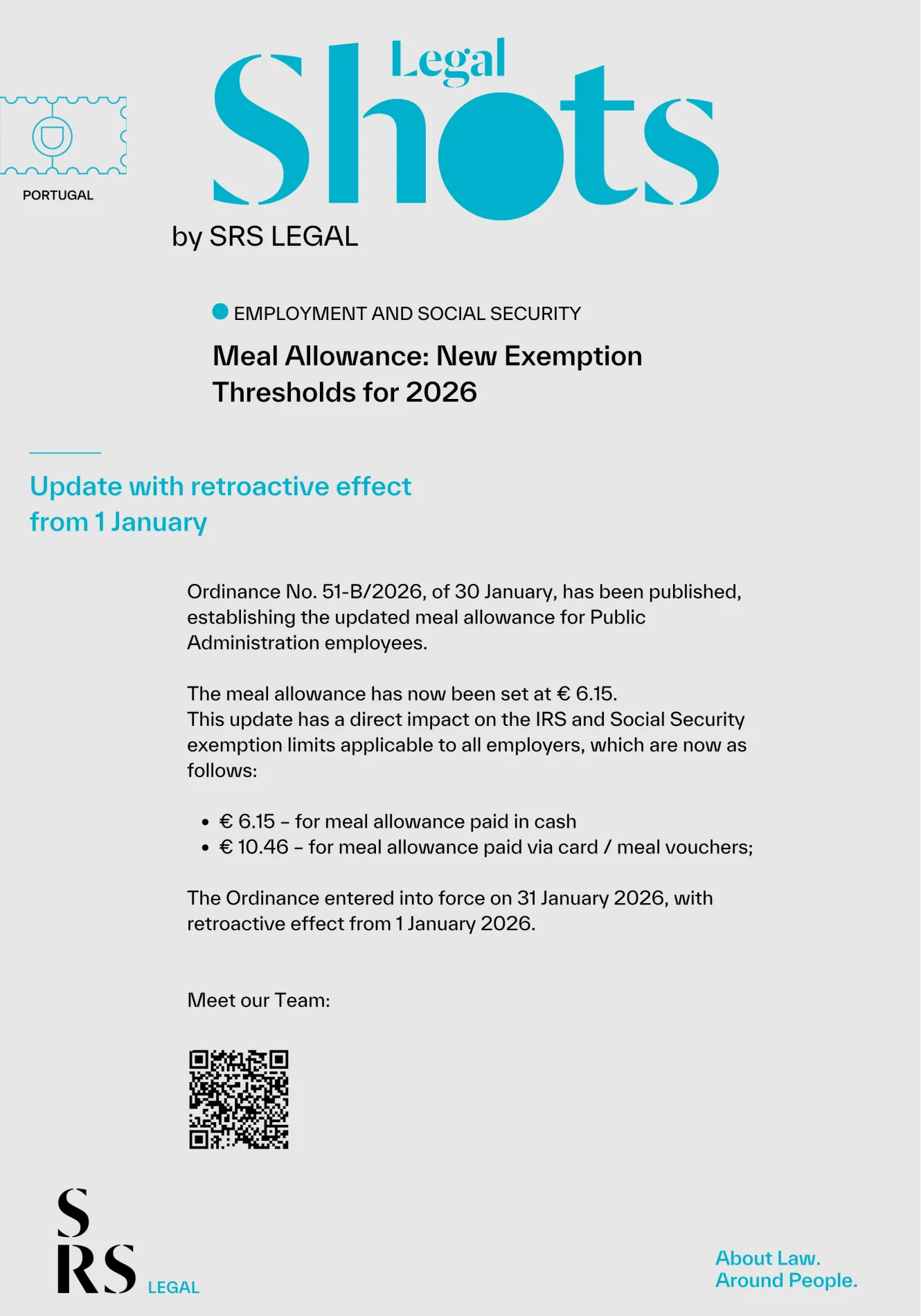 The Employment and Social Security Law Department at SRS Legal highlights the publication of Ordinance No. 51-B/2026, of 30 January, which updates the meal allowance for 2026, with an impact on income tax and social security exemption limits, with retroactive effect from 1 January 2026.